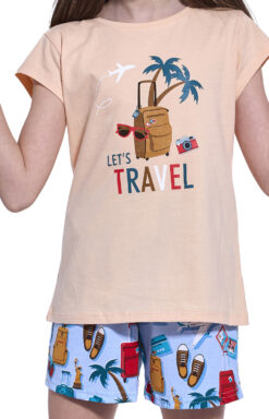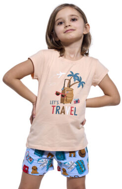 - Brzoskwiniowa koszulka, nadruk z walizką, palmami oraz napisem Let’s Travel.