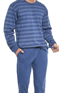 - Długa piżama męska z wygodnymi kieszeniami i troczkiem w spodniach.