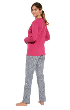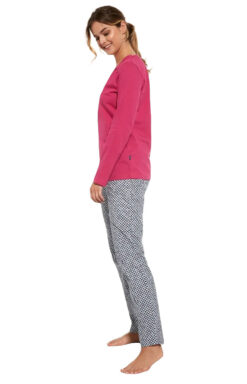 - Elegancka piżama damska z długim rękawem i długimi spodniami idealna na chłodniejsze noce.