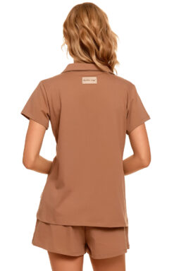 - Bluzka zapinana na guziczki, z eleganckim kołnierzykiem i krótkim rękawkiem.