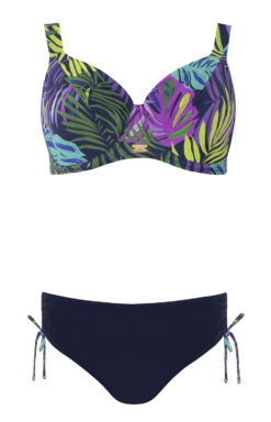 - Majtki w komplecie to ładnie skrojone klasyczne figi wykończone podszewką o roślinnym, letnim wzorze w liście, kokosy, ananasy i arbuzy, ozdobione złotą nitką.