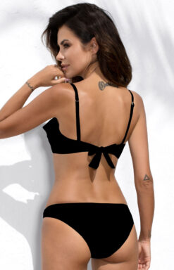 • Biustonosz typu bardotka na fiszbinach posiada usztywnione miseczki, które dobrze kształtują i utrzymują biust oraz dodatkowe wyjmowane wkładki push-up, pięknie powiększające biust o rozmiar.