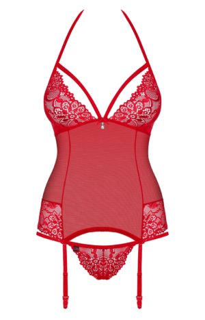 - Czerwona siateczka, urocza koronka oraz wyjątkowe zdobienia w postaci zmysłowych gumeczek i biżuteryjnych zawieszek. Chcesz więcej? Proszę bardzo! Co powiesz na seksowne wiązanie na plecach, uwodzicielskie paski do pończoch i stringi kusząco eksponujące pośladki? Ajjj, będzie gorąco!