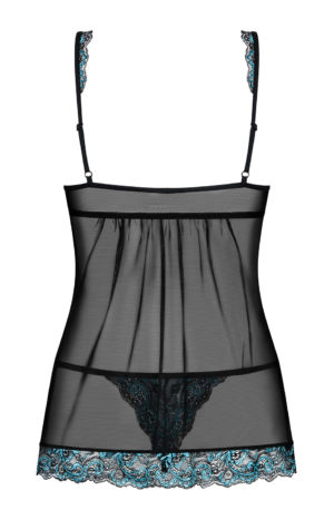 - Rozkoszna koszulka z koronką w intensywnym, turkusowym kolorze.Prześwitująca siateczka połączona z koronką ozdobioną błyszczącą nitką.