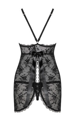 • Zagrajmy w krótką grę… Zamknij oczy i wyobraź sobie, w czym chciałabyś wystąpić w sypialni podczas Waszego specjalnego wieczoru. Mała podpowiedź? Hmmm… lekkość koronki, frywolne kokardki, seksowne wycięcia… właśnie o tym myślisz, prawda? Możesz spełnić swoje (i jego) pragnienia wybierając babydoll Behindy. Strój uzupełnią czarne, pasujące stringi o kwiatowym wzorze. Nie zwlekaj i pozwól sobie na chwilę przyjemności.