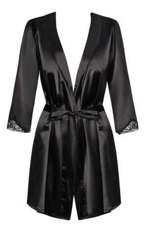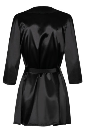 - Szlafrok Satinia w pięknym, czarnym kolorze, uszyty z połyskującej tkaniny.