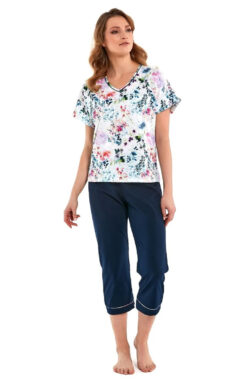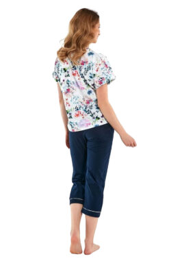 - Do kompletu dołączono spodenki piżamowe długości 7/8 wykonane z jednokolorowej, granatowej dzianiny.