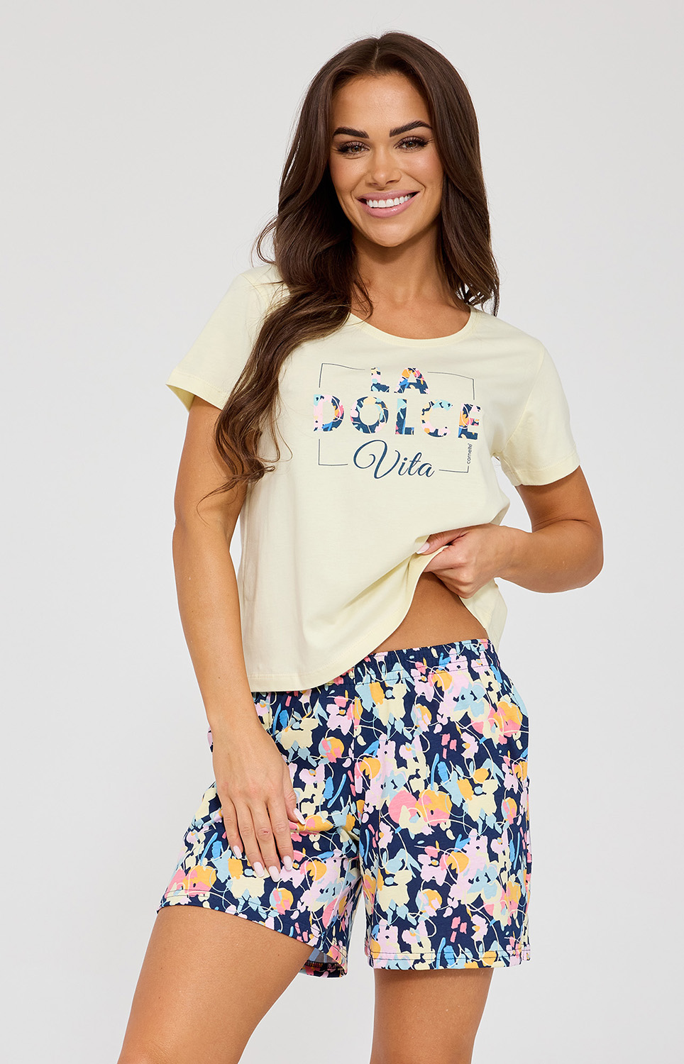 - Góra w delikatnym, jasnożółtym kolorzezdobiona modnym napisem „La Dolce Vita” z delikatnym, kolorowym akcentem graficznym.