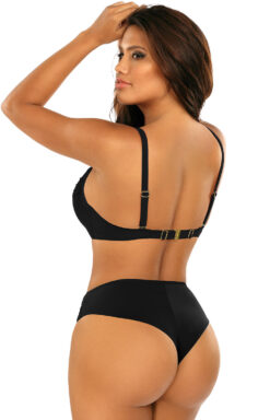 - Biustonosz typu bardotka na fiszbinach posiada usztywnione miseczki formowane termicznie (wkładki nie są wyjmowane) oraz dodatkowe boczne fiszbiny.