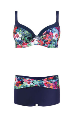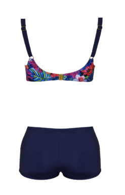 - Majtki w komplecie to granatowe szorty z ozdobnym pasem z przodu, świetnie dopasowują się do ciała, tuszują niedoskonałości, optycznie wyszczuplają biodra. Tył gładki.