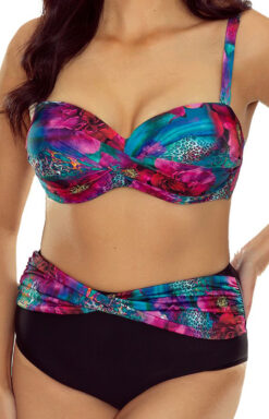- Biustonosz typu bardotka na fiszbinach posiada usztywnione miseczki, które dobrze kształtują i utrzymują biust oraz dodatkowe wyjmowane wkładki push-up, pięknie powiększające biust o rozmiar.