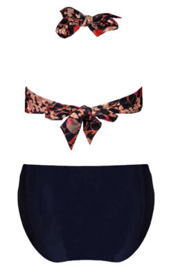 - W komplecie ładnie skrojone czarne figi o wysokim stanie z lamówką w kolorze pasującym do biustonosza.