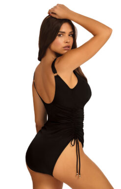 - Kostium po bokach ściągany delikatnymi troczkami, co pozwana na regulację wysokości boku.